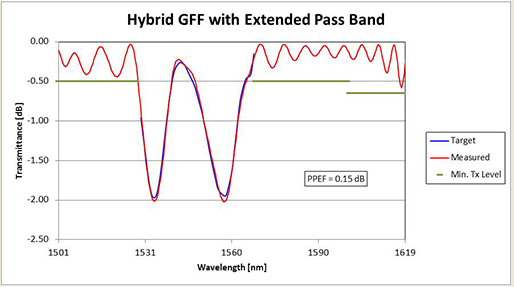 以下是一個(gè)混合GFF的示例,在GFF波長(zhǎng)范圍的上方和下方都有擴(kuò)展的通帶(T> -0.5 dB)。