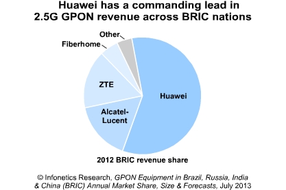 * 2012年金磚四國GPON設備市場收入達到14億美元,所有收入都來自2.5G GPON;