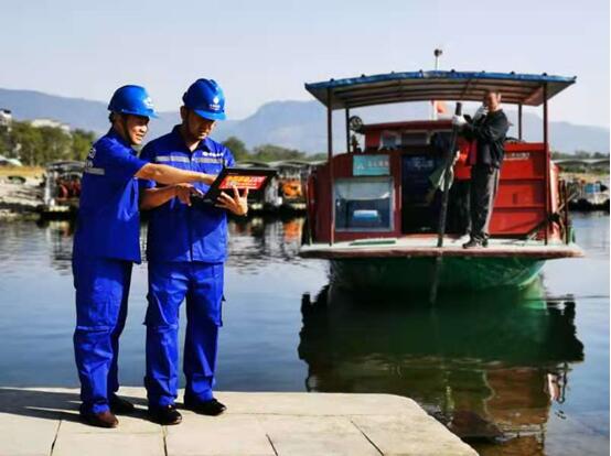 在漓江水道上開展網(wǎng)絡(luò)建設(shè)的廣西移動工作人員。 徐先麗/攝