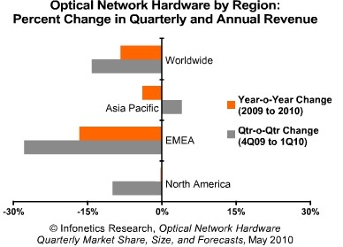 【訊石光通訊咨詢網(wǎng)編譯】繼2009年第四季度全球光網(wǎng)絡(luò)硬件市場(chǎng)的強(qiáng)勁增長(zhǎng)之后,在2010年第一季度顯現(xiàn)出明顯的季節(jié)性下降。2010年第一季度,全球光網(wǎng)絡(luò)硬件市場(chǎng)下降4%達(dá)到29,5億美元。