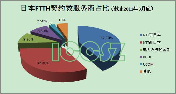 * FTTH契約數(shù)為2023.6萬,相比去年年底增長率為2.3%。各服務(wù)供應(yīng)商份額相比2010年底基本持平,東西NTT占比74.4%(下滑0.1個百分點),電力系統(tǒng)經(jīng)營者占比9.2%(上升0.1個百分點),KDDI占比8.8%(上升0.2個百分點);