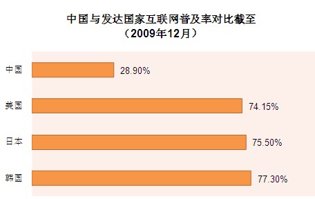 從普及率來看,數(shù)據(jù)顯示,中國(guó)的互聯(lián)網(wǎng)普及率達(dá)到28.9%,高于25.6%的世界平均水平。但與發(fā)達(dá)國(guó)家相比,還存在較大的差距。據(jù)中國(guó)互聯(lián)網(wǎng)絡(luò)信息中心報(bào)告顯示,截至2009年12月,美國(guó)、日本和韓國(guó)的互聯(lián)網(wǎng)普及率分別達(dá)到74.1%,75.5%和77.3%。