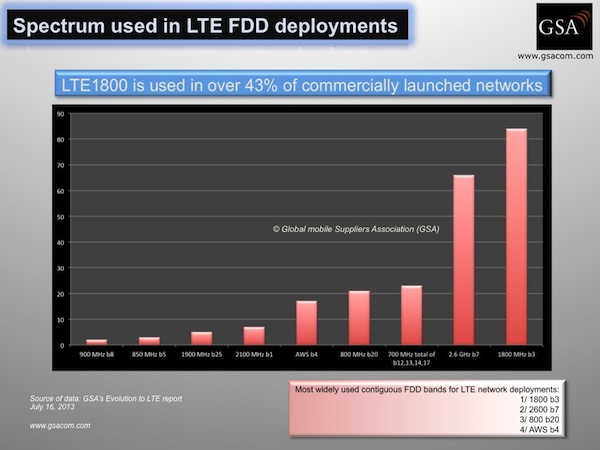 大多數(shù)運營商部署FDD模式的LTE標準。最廣泛使用的頻帶仍然是1800 MHz(band 3),占已推出商業(yè)LTE FDD網(wǎng)絡的43%以上;下一個主流是2.6 GHz(band 7),占已推出LTE FDD網(wǎng)絡的34%;其次是800 MHz(band 20),占比為11%;緊隨其后的為AWS(band 4),占比約為9%。