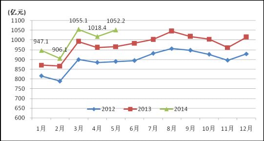 圖1. 2012-2014年各月電信主營業(yè)務(wù)收入比較