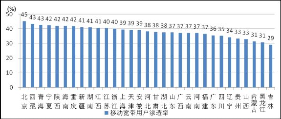 5月,東、中、西部地區(qū)移動(dòng)寬帶用戶分別比上年末凈增3338.3、1826.8、1894.7萬戶,東部地區(qū)凈增用戶占比達(dá)47.3%。東中西部地區(qū)移動(dòng)寬帶用戶普及情況差異不大,東部地區(qū)移動(dòng)寬帶用戶滲透率最高,達(dá)38.2%,分別比中西部地區(qū)高1.5、0.7個(gè)百分點(diǎn)。各省之間移動(dòng)寬帶用戶滲透率差異較小,滲透率高于40%的省份超過三分之一,其中北京全國最高,達(dá)到45.2%,吉林滲透率不足30%,僅為29.2%。