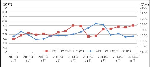 圖4. 2013-2014年各月手機(jī)上網(wǎng)和無線上網(wǎng)卡用戶比較