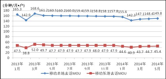 圖5. 2013-2014年移動(dòng)本地和長途去話MOU值各月比較
