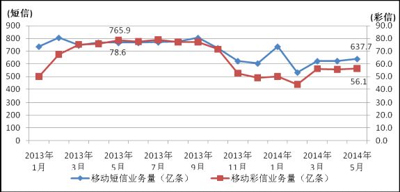 圖6. 2013-2014年移動(dòng)短信業(yè)務(wù)量和彩信業(yè)務(wù)量各月比較