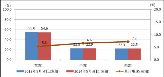 圖9. 2014年5月東、中、西部電信主營業(yè)務(wù)收入同期比較
