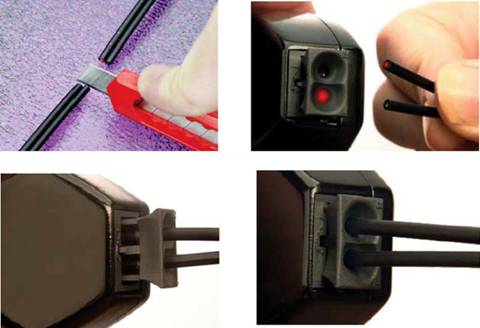塑料光纖的施工連接非常便利,如圖3所示,光纖端面以一把裁紙刀切割,插入收發(fā)模塊即可實現(xiàn)耦合連接。