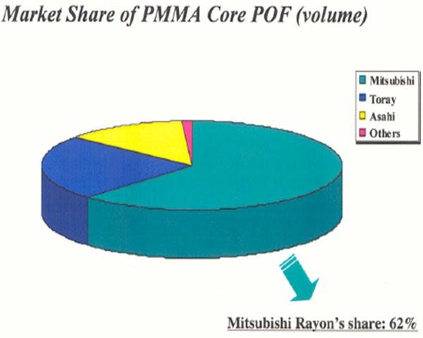國內(nèi)塑料光纖產(chǎn)業(yè)面臨的另外一個挑戰(zhàn)是其規(guī)模,目前塑料光纖的全球市場被日本的三菱(Mitsubishi)、東麗(Toray)和旭硝子(Asahi)三家公司瓜分,在國內(nèi)FTTH市場上,他們也將會是國內(nèi)企業(yè)的強(qiáng)力競爭對手,國內(nèi)企業(yè)必須考慮我們的競爭優(yōu)勢在哪里。