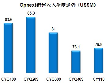 Opnext公司本季度營業(yè)收入增長70萬美元至7680萬美元,環(huán)比增長1%。其中10G及以下產(chǎn)品銷售收入下降620萬美元至4890萬美元,環(huán)比下降11%,主要受300針可調(diào)產(chǎn)品和X2模塊銷售下降的影響;40G及以上產(chǎn)品銷售收入增長510萬美元至2180萬美元,環(huán)比增長30%,主要來自40G模塊的增長;工業(yè)和商業(yè)產(chǎn)品銷售收入增長190萬美元至610萬美元,環(huán)比增長45%。