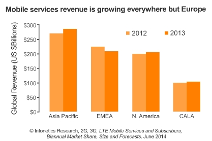 Infonetics 移動基礎設施和運營商經濟首席分析師Stéphane Téral稱:“2013年歐洲再一次拖累全球移動服務的收入,由于受到移動飽和與消費疲軟的困擾,即使歐元區(qū)最大的經濟體德國也如此,同時亦受到激烈的價格競爭,包括比利時、法國、意大利、西班牙和荷蘭,這一系列不利因素困擾著歐洲通信業(yè)的發(fā)展。”