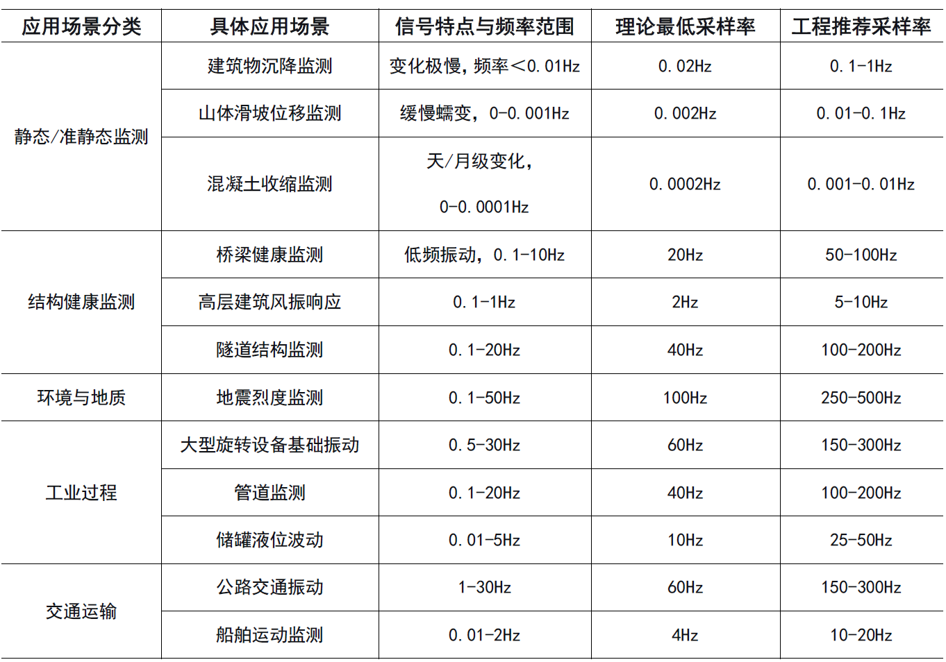 下面整理了部分應(yīng)用場下的傳感采樣率及推薦使用的采樣率,僅供大家參考。