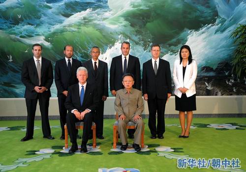 這張朝中社5日提供的照片顯示的是朝鮮最高領(lǐng)導(dǎo)人金正日(前右)和美國前總統(tǒng)克林頓(前左)在平壤合影。據(jù)朝中社報道,朝鮮最高領(lǐng)導(dǎo)人金正日4日在平壤會見了來訪的美國前總統(tǒng)克林頓。新華社/朝中社
