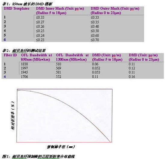 根據(jù)IEEE802.3ae標準,當光源的功率分布符合TIA/EIA-455-203 標準,同時多模光纖的性能符合TIA/EIA-492AAAC標準時,在850nm波長,保證光纖的有效帶寬EBW(Effective Bandwidth)大于2000MHz·km,在10Gigabit的網(wǎng)絡(luò)系統(tǒng)中達到300米以上的傳輸距離。