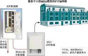 圖1 FTTM結(jié)構(gòu)與單住戶PON相似。對于小型的MDU建筑,MDU光纖終端可以安裝在建筑的外面。單獨(dú)的光纜把此終端與建筑物內(nèi)個(gè)別的訂戶連接起來。