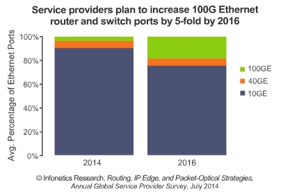 *電信業(yè)正走向100G:在2014年采購10/40/100GE路由器和運(yùn)營商以太網(wǎng)交換機(jī)中有4%是100GE,到2016年預(yù)計(jì)將增長接近5倍,到達(dá)19%。