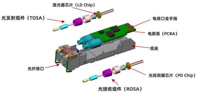 光模塊通常由光器件(BOSA)包括發(fā)射器件(TOSA,含激光器)、光接收器件(ROSA,含光探測器)以及其他功能電路和光(電)接口等部分組成。在發(fā)射端,驅(qū)動芯片對原始電信號進(jìn)行處理,然后驅(qū)動半導(dǎo)體激光器(LD)或發(fā)光二極管(LED)發(fā)射出調(diào)制光信號;在接收端,光信號進(jìn)來之后,由光探測二極管轉(zhuǎn)換為電信號,經(jīng)前置放大器后輸出電信號。