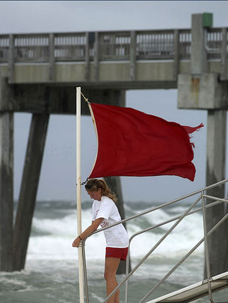 8月17日,美國佛羅里達州彭薩科拉,女海灘警衛(wèi)隊員正在海邊安置警示旗。