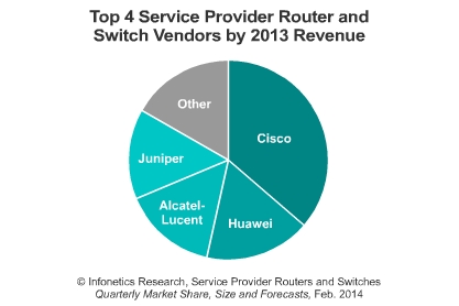*2013年全路運營商路由器和交換機市場(包括IP邊緣路由器、核心路由器和運營商以太網(wǎng)交換機(CES))收入為145億美元,相比2012年上漲2%;