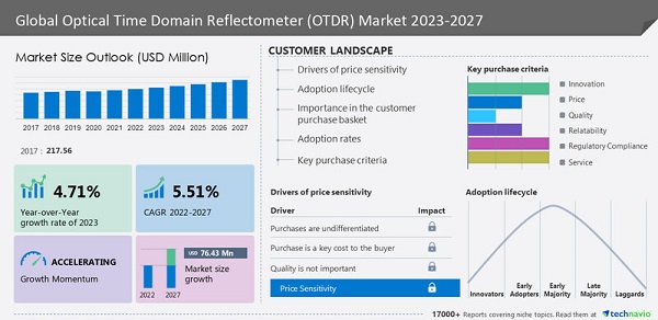 ICC訊(編譯:Nina)據(jù)市場(chǎng)調(diào)研公司Technavio預(yù)測(cè),從2022年到2027年,光時(shí)域反射計(jì)(OTDR)市場(chǎng)將增長(zhǎng)7643萬美元。對(duì)Tier-2認(rèn)證標(biāo)準(zhǔn)需求的增加是推動(dòng)市場(chǎng)增長(zhǎng)的關(guān)鍵因素。