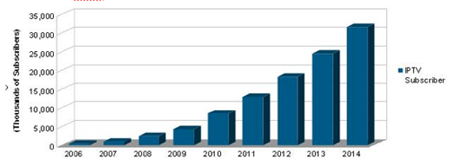 由政府推動(dòng)各家電信、廣播和互聯(lián)網(wǎng)運(yùn)營(yíng)商加快覆蓋速度,中國(guó)網(wǎng)絡(luò)電視(IPTV)用戶將在未來幾年繼續(xù)快速增長(zhǎng)。