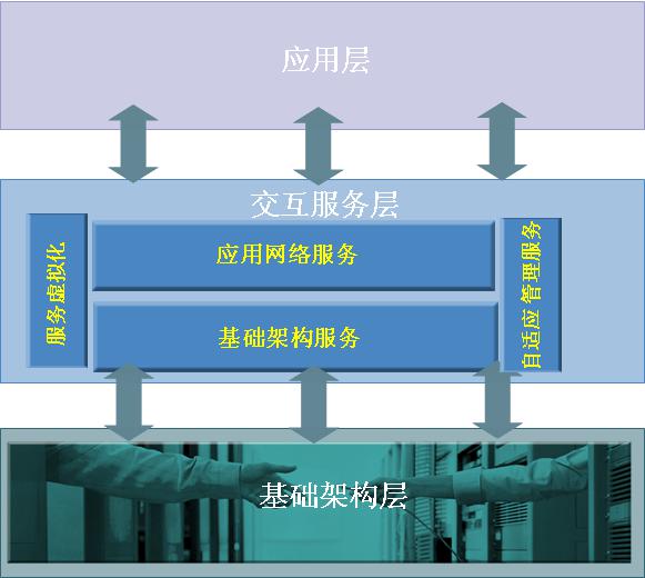 在圖中,隔在物理架構(gòu)和用戶之間的“交互服務(wù)層”實(shí)現(xiàn)了向上提供服務(wù)、向下屏蔽復(fù)雜的物理結(jié)構(gòu)的作用,使得網(wǎng)絡(luò)使用者看到的網(wǎng)絡(luò)不是由復(fù)雜的基礎(chǔ)物理功能實(shí)體構(gòu)成的,而是一個(gè)個(gè)智能服務(wù)——安全服務(wù)、移動(dòng)服務(wù)、計(jì)算服務(wù)、存儲(chǔ)服務(wù)……等等,至于這些服務(wù)是由哪些實(shí)際存在的物理資源所提供,管理員和上層業(yè)務(wù)都無需關(guān)心,交互服務(wù)層解決了一切資源的調(diào)度和高效復(fù)用問題。
