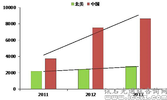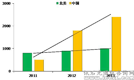 從以上兩個圖還可以看出,近年來北美地區(qū)FTTH發(fā)展速度非常緩慢,從趨勢線來看基本上處于水平狀態(tài),而我國的趨勢線則約為夾角30度左右。如果以北美FTTH發(fā)展作為模版參考,2014年后我國的FTTH市場將處于一個什么樣的發(fā)展時期?成長期、成熟期還是衰退期?這應(yīng)該引起注意。