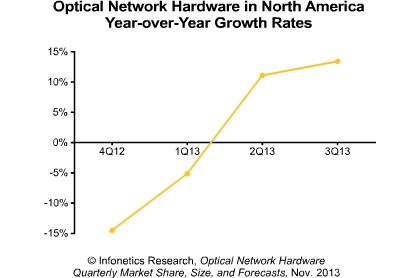 *2013年三季度,北美光網(wǎng)絡(luò)支出同比增長(zhǎng)13.4%,環(huán)比增長(zhǎng)11.1%,主要是100G部署的驅(qū)動(dòng);