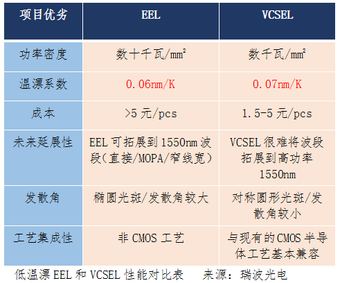 “EEL相比VCSEL的最大技術(shù)優(yōu)勢是光功率密度非常高,比VCSEL至少高1個數(shù)量級。目前瑞波光電開發(fā)的905nm EEL芯片的功率密度可以達到50KW/mm2,而當前VCSEL通過多結(jié)工藝將功率密度最高提升到2KW/mm2,但仍與EEL有很大的差距?!?