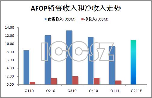 據(jù)2011年4月25日AFOP公布2011年第一季度財報顯示: 銷售收入為945萬美元,同比增長12.4%,環(huán)比下滑18.8%。凈收入約為102.1萬美元,或每股盈利12美分(基于880萬流通股),去年同期凈收入為64.1萬美元,或每股盈利8美分(基于850萬流通股),上個季度凈收入為170.1萬美元,或每股盈利20美分(基于870萬流通股)。