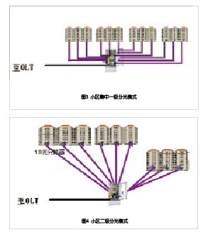 在分光方式上,運營商可根據(jù)建筑物的形態(tài)和用戶分布,靈活選擇一級或二級分光,總體的原則為:用戶密度很低的住宅或工業(yè)園區(qū),盡量選擇在小區(qū)集中分光,以提高PON端口和分光器的利用率;用戶密度較低的住宅或園區(qū),可選擇先在小區(qū)內一級分光,在樓內做二級分光;用戶密度中等的小高層住宅,可選擇樓內一級集中分光;用戶密度較高的小高層塔樓或超高住宅,可選擇樓內二級分光。