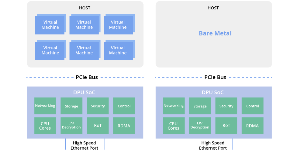 與基于FPGA的架構(gòu)不同,基于應(yīng)用專用集成電路(ASIC)的DPU SoC將專用加速器的性能與通用處理器的可編程性相結(jié)合,解決了成本、功耗和功能等方面的問題。尤其是針對下一代100G服務(wù)器,它們在成本、功耗、高吞吐量和靈活的編程能力方面具有優(yōu)勢,DPU SoC可支持應(yīng)用管理、虛擬機、容器和裸金屬應(yīng)用。