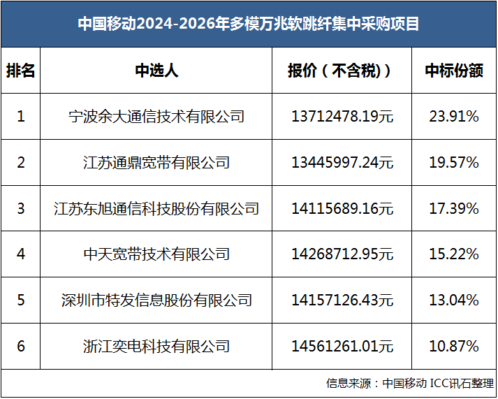 ICC訊 11月20日,中國移動發(fā)布2024-2026年多模萬兆軟跳纖產(chǎn)品集中采購項目中標候選人公示,余大通信、通鼎寬帶、東旭通信、中天寬帶、特發(fā)信息和奕電科技成功入選,余大通信以23.91%份額排名第一。