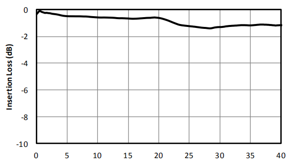 插入損耗可以用網(wǎng)絡(luò)分析儀的S21參數(shù)進(jìn)行評估,插入損耗反映了系統(tǒng)傳輸路徑的情況,插入損耗的數(shù)值越小代表指標(biāo)越好。如圖1-3所示為典型的BiasT的S21參數(shù)測試圖,從圖中可以看出在5GHz的頻點(diǎn),BiasT的插損約為0.5dB;在30GHz的頻點(diǎn),BiasT的插損約為1.3dB。0.5dB<1.3dB,說明5GHz的插損指標(biāo)更好,插入損耗的絕對值值越小代表指標(biāo)越好。