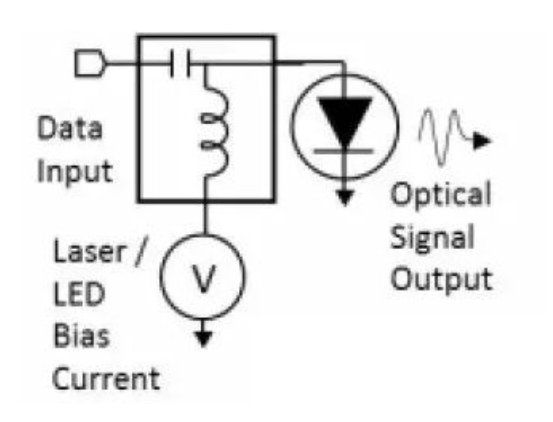BiasT可以用于驅(qū)動激光器,是一種成熟的應(yīng)用。激光器對過電流、過電壓以及靜電干擾極為敏感。因此,需要穩(wěn)定的工作條件與可靠的數(shù)據(jù)輸入,目前主流的解決辦法是使用BiasT進(jìn)行激光器驅(qū)動。圖1-14為 BiasT與激光器驅(qū)動示意圖,激光器所需驅(qū)動電流通過偏置器DC端注入,所需的通信數(shù)據(jù)通過RF端口注入。