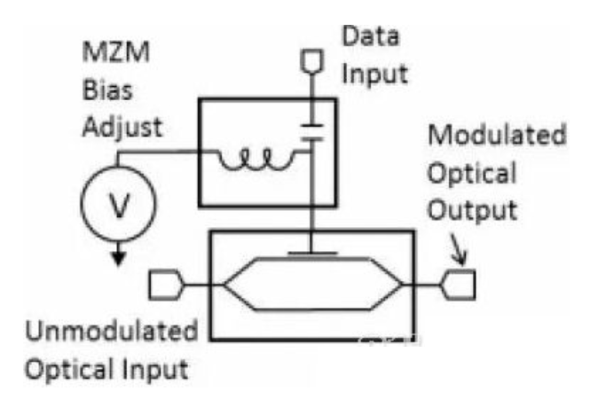 BiasT可以用于電光調(diào)制器的直流偏置端口,是一項(xiàng)十分成熟的應(yīng)用,BiasT已成為電光調(diào)制器的必備組件。在電光調(diào)制過程中,BiasT扮演著至關(guān)重要的角色。如圖1-13所示為BiasT驅(qū)動電光調(diào)制器的示意圖,BiasT的RF端作為調(diào)制器的數(shù)據(jù)輸入源,DC端作為MZM偏置調(diào)節(jié)的供電輸入,RF&DC端把信號輸入調(diào)制器,完成電光調(diào)制。可以看出沒有BiasT就無法完成電光調(diào)制器的調(diào)制。