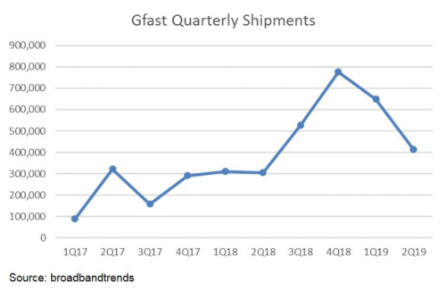 BBT數(shù)據(jù)顯示,迄今為止,在全球范圍內(nèi),向運營商交付的Gfast端口約為385萬個,其中大部分出貨給了兩家運營商--BT的Openreach和Swisscom。盡管澳大利亞的NBN,以及德國電信也一直是Gfast的擁護者,但這些運營商(NBN除外)也將重點轉(zhuǎn)移到了FTTP上。