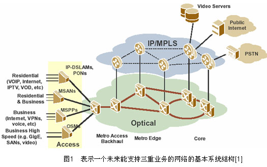 圖1表示一個(gè)未來(lái)能支持三重業(yè)務(wù)的網(wǎng)絡(luò)的基本系統(tǒng)結(jié)構(gòu),包括三主要部分:接入、IP/MPLS 和光層。靈活性光層對(duì)服務(wù)的接入網(wǎng)和IP/MPLS 網(wǎng)絡(luò)層提供全部傳輸和路由,同時(shí)也能直接遞送一些服務(wù)到終端用戶,例如高速以太網(wǎng)或 SAN 等。