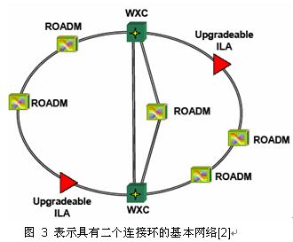 以往的 DWDM 城域光網(wǎng)只是包括3-6個(gè)節(jié)點(diǎn)的小型環(huán)網(wǎng)。發(fā)展中的城域光網(wǎng)的系統(tǒng)結(jié)構(gòu)應(yīng)是能支持包括20-50個(gè)節(jié)點(diǎn)群的網(wǎng)格網(wǎng)。為降低這種擴(kuò)大光網(wǎng)的成本,無(wú)再生的光透明傳輸距離至少應(yīng)達(dá)1000公里,包含的光網(wǎng)節(jié)點(diǎn)在16個(gè)以上。為了使網(wǎng)絡(luò)結(jié)構(gòu)能不斷擴(kuò)展,每個(gè)節(jié)點(diǎn)的連接維度必須在不影響現(xiàn)有業(yè)務(wù)的情況下增加,網(wǎng)格網(wǎng)的節(jié)點(diǎn)的連接應(yīng)能擴(kuò)充到 8 度。圖 3 表示具有二個(gè)連接環(huán)的基本網(wǎng)絡(luò)[2],在二個(gè)環(huán)的連接處的節(jié)點(diǎn)是 4 度WXC,其他的節(jié)點(diǎn)都是2度ROADM,其中還有二個(gè)節(jié)點(diǎn)是可升級(jí)的在線放大器ILA。