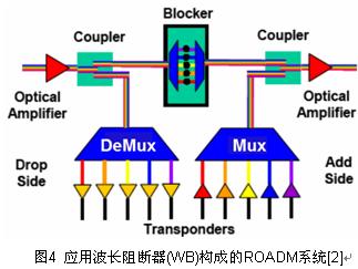 波長(zhǎng)阻斷器(WB)是最簡(jiǎn)單的交換器件,它允許特定的波長(zhǎng)通過(guò)或阻斷。圖4 應(yīng)用波長(zhǎng)阻斷器(WB)構(gòu)