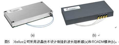 成的ROADM系統(tǒng)[2],圖中只表示了單方向的信號(hào)流。因?yàn)檫@里沒(méi)有實(shí)際的交換發(fā)生,波長(zhǎng)阻斷器有時(shí)被看成為 1x1光開關(guān)。阻斷器通常采用液晶技術(shù),但其他方法也可用如 MEMS 等。波長(zhǎng)阻斷器利用一組連續(xù)的單元以阻斷波譜,它能支持不同的信道間隔,例如100Gb/s和50Gb/s混合的信道可由單個(gè)器件提供。這能力目前尚未在任何現(xiàn)有系統(tǒng)上應(yīng)用,但能提供今后10Gb/s和40Gb/s混合系統(tǒng)采用的可能。波長(zhǎng)阻斷器是成熟技術(shù),但由于解決方案不易集成使成本比較高。圖5是Xtellus公司采用液晶技術(shù)設(shè)計(jì)制造的波長(zhǎng)阻斷器和ROADM模塊。Xtellus 波長(zhǎng)阻斷器可以應(yīng)用于C波段或L波段間隔為100GHz或50GHz的DWDM系統(tǒng),插入損耗小于5dB, 消光比大于40dB,動(dòng)態(tài)均衡可達(dá)15dB。Xtellus 的ROADM模塊具有波長(zhǎng)分出、插入、阻斷和直通、均衡和功率監(jiān)視等功能,可用于C波段或L波段間隔為100GHz的DWDM系統(tǒng),輸入到輸出的全部插入損耗不大于8.5 dB, 功耗低于4w。