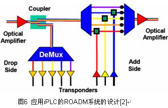 利用集成平面光路(iPLC)技術(shù)的ROADM相對(duì)于波長(zhǎng)阻斷器由于或是直通或是插入到輸出之間增加了交換使設(shè)計(jì)增添復(fù)雜度。iPLC 通常采用陣列波導(dǎo)光柵 (AWG) 將信號(hào)分出不同波長(zhǎng)以及利用熱驅(qū)動(dòng)的MZI開關(guān)改變或是直通或是插入的波長(zhǎng)路徑。應(yīng)用iPLC的ROADM系統(tǒng)的設(shè)計(jì)如圖6所表示,通過(guò)集成化可以降低成本,但也與用波長(zhǎng)阻斷器一樣不能構(gòu)成網(wǎng)格。目前iPLC技術(shù)初步應(yīng)用的是小規(guī)模開關(guān)(2 x1)。要構(gòu)成規(guī)模大的開關(guān)模塊比較困難,因?yàn)楫?dāng)輸入和輸出之間交叉數(shù)量增加時(shí)將導(dǎo)致衰減和復(fù)雜度大大增加。