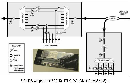圖7表示由JDS Uniphase公司開發(fā)的應(yīng)用iPLC的32信道 iPLC ROADM的系統(tǒng)結(jié)構(gòu)[3]。ROADM分成二部分,分出方面的解復(fù)用(DEMUX-T)模塊和可重構(gòu)光插入復(fù)用(ROAM)模塊。ROAM模塊包含2 x1開關(guān)和可變光衰減器(VOA)使任意信道插入或直通。插入信道也有單獨(dú)的快門供隔離用。另外,每一個(gè)分出、插入和直通路徑都有集成的抽頭將信號(hào)送到安裝一起的探測(cè)器陣列。因而,本模塊包含有96個(gè)濾波器、96個(gè)抽頭、96個(gè)光電探測(cè)器、32個(gè)開關(guān)、32個(gè)VOA、32個(gè)快門。iPLC 芯片的照相也插于圖7中下方。