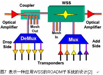 光交換元件發(fā)展的下一步是波長(zhǎng)選擇開關(guān) (WSS)。與 iPLC相比WSS增加了交換維度,能用來(lái)構(gòu)成網(wǎng)格,還可改善直通信道的性能。WSS應(yīng)用于網(wǎng)格節(jié)點(diǎn)開始不久,但WSS模塊已能從幾家供應(yīng)商獲得?,F(xiàn)有的解決方案可在4到10個(gè)端口之間交換波長(zhǎng)。最初的裝置是用MEMS微鏡的自由空間光開關(guān)將波長(zhǎng)引到特定端口?;谝壕Ш蚉LC技術(shù)的WSS也開發(fā)完成, 用LC和PLC作成的WSS其優(yōu)點(diǎn)是比較可靠,因?yàn)樗枪虘B(tài)器件,沒(méi)有活動(dòng)部分。對(duì)PLC構(gòu)成的器件來(lái)說(shuō),其級(jí)聯(lián)能力和插入損耗仍是人們關(guān)注的問(wèn)題?;贚C的設(shè)備也許能應(yīng)用于有限的光廣播。這可能對(duì)節(jié)點(diǎn)設(shè)計(jì)有重要意義,它可以明顯降低分束損耗,如果廣播通過(guò)光開關(guān)實(shí)現(xiàn)。圖7表示一種應(yīng)用WSS的ROADM子系統(tǒng)的設(shè)計(jì),這可以升級(jí)為網(wǎng)格[2]。為了支持光廣播,一部分分出信號(hào)被送到分出邊,而WSS應(yīng)用于插入邊。