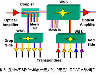 在選用ROADM時(shí),要考慮幾個(gè)基本特性。有些如iPLC只能提供特定波長(zhǎng)到特定的輸出端口,而WSS可以造成與波長(zhǎng)無(wú)關(guān)(無(wú)色)的輸出端口。嚴(yán)格地說(shuō),只有波長(zhǎng)無(wú)關(guān)器件才是真正的波長(zhǎng)選擇開關(guān),提供必須的功能以支持網(wǎng)格所要求的多度節(jié)點(diǎn)。多度節(jié)點(diǎn)的插/分能力可用固定復(fù)用器來(lái)實(shí)現(xiàn)如圖7所示。一種真正的無(wú)色方案可通過(guò)采用WSS代替固定復(fù)用器來(lái)實(shí)現(xiàn),如圖8所示,但成本增加。