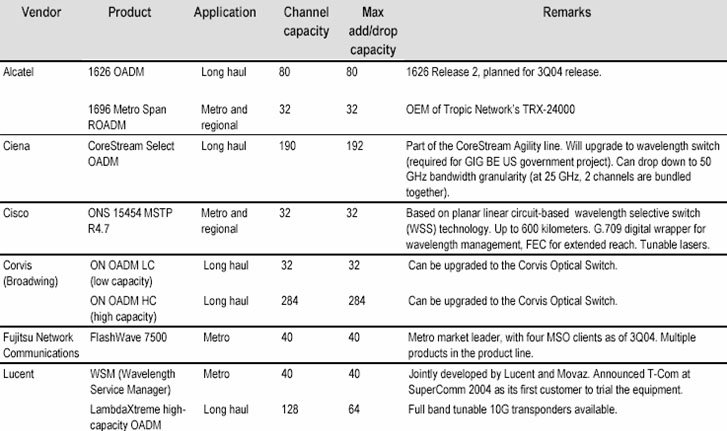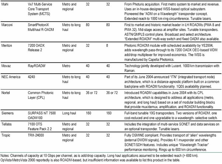 ROADM 的市場(chǎng)可以分為城域,即城市范圍內(nèi),和長(zhǎng)途,特別是延長(zhǎng)距離(>600km)城市之間的應(yīng)用。客戶的需求、和多數(shù)情況下提供的產(chǎn)品可以是大不相同的。城域應(yīng)用又可細(xì)分為基礎(chǔ)設(shè)施 – ROADM由運(yùn)營(yíng)商裝備作為公共網(wǎng)絡(luò)利用,和客戶接入管理服務(wù) – 典型情況是設(shè)備提供的管理服務(wù)賣給專門的客戶。根據(jù) RHK 在2005年的統(tǒng)計(jì),主要的 ROADM 產(chǎn)品和供應(yīng)商如表2所列[4]。