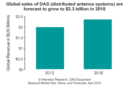 *2013年全球DAS市場(chǎng)收入為20億美元,相比2012年上漲2%,其總的出貨量為120萬(wàn)節(jié)點(diǎn),而2013年北美市場(chǎng)是驅(qū)動(dòng)力,該地區(qū)收入同比增長(zhǎng)10%。