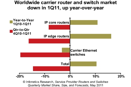 * 2011年第一季度,全球服務(wù)供應(yīng)商路由器和交換機(jī)市場(chǎng),包括IP邊緣路由器、核心路由器和運(yùn)營(yíng)商以太網(wǎng)交換機(jī),達(dá)到32億美元,環(huán)比下滑14.7%,同比增長(zhǎng)10.4%;